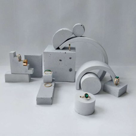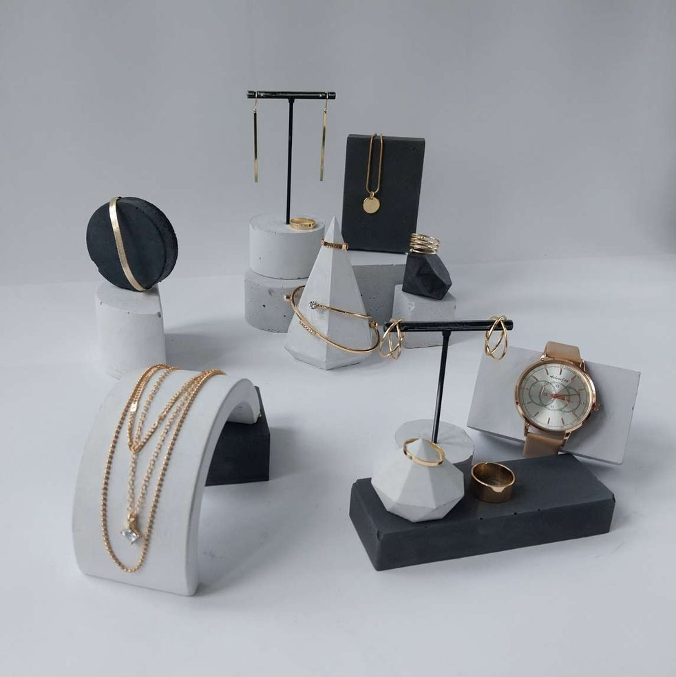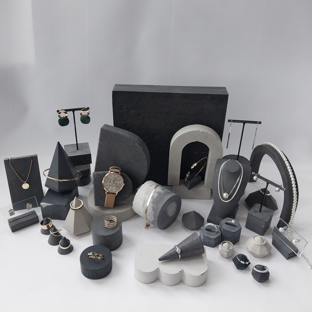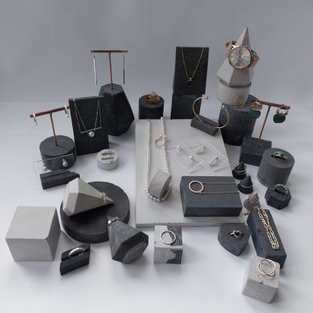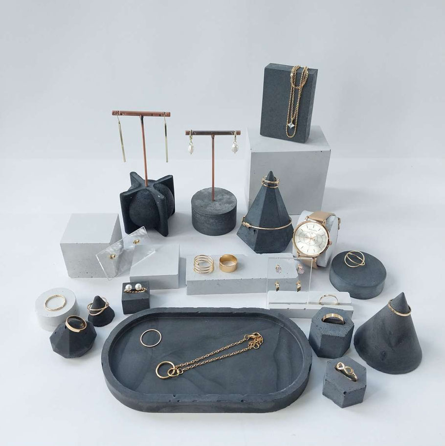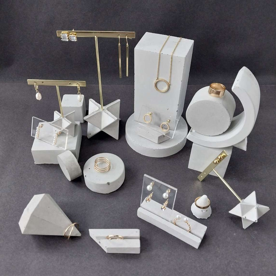 Eine Auswahl handgefertigter Schmuckständer und skulpturaler Schmuckhalter. Durch ihre unterschiedlichen Set-Kombinationen, Texturen, Schattierungen und natürlichen Betonfarbtöne – sowie durch ihre besonderen Formen – entstehen einzigartige Schmuckdisplays.