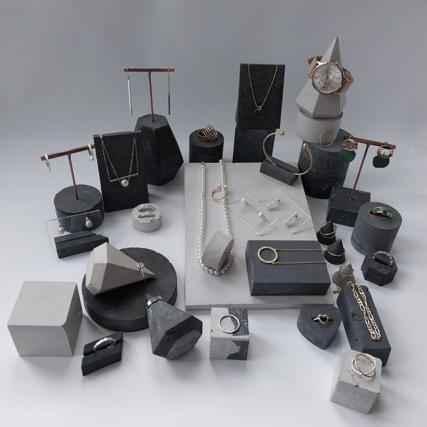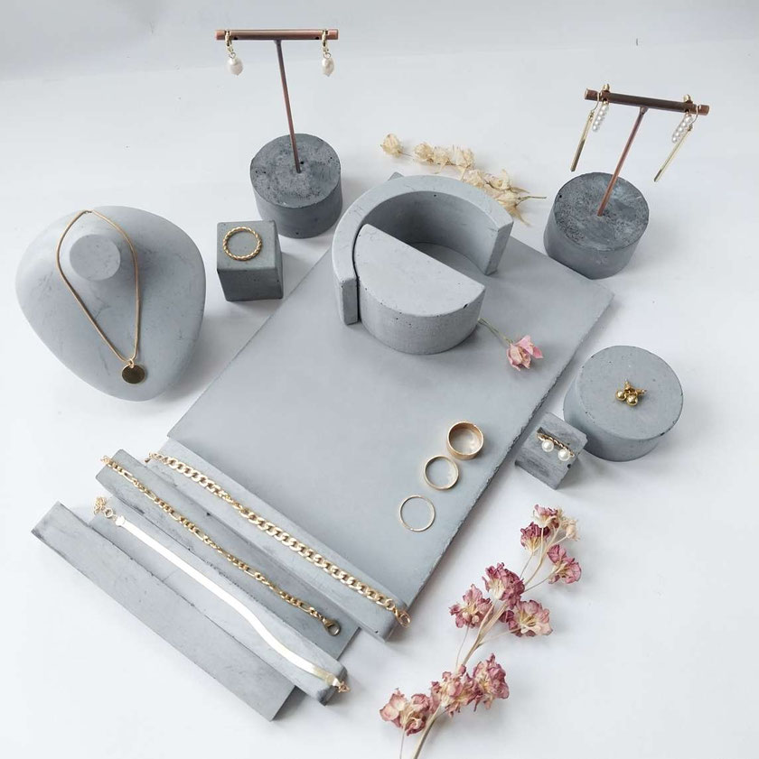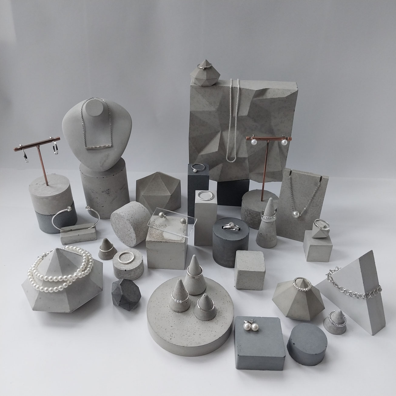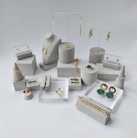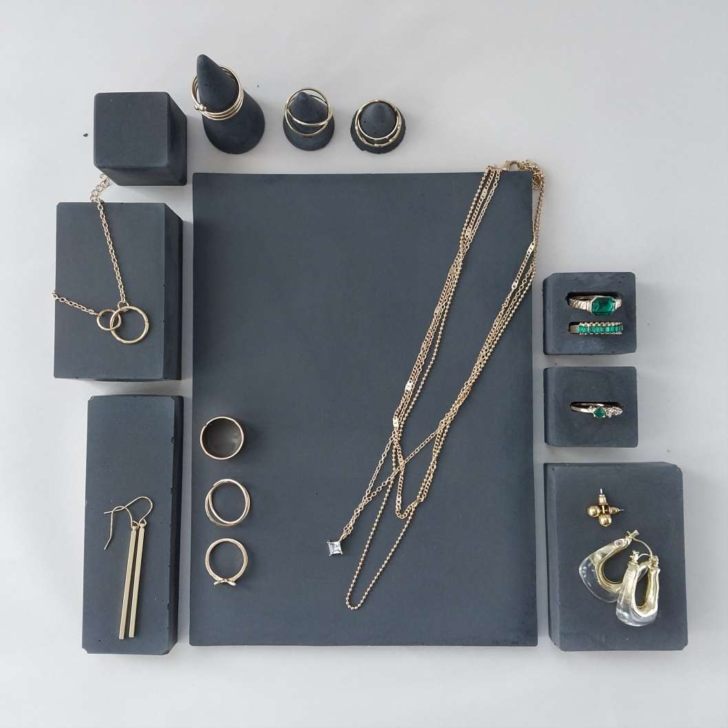 Eine Auswahl handgefertigter Schmuckständer und skulpturaler Schmuckhalter. Durch ihre unterschiedlichen Set-Kombinationen, Texturen, Schattierungen und natürlichen Betonfarbtöne – sowie durch ihre besonderen Formen – entstehen einzigartige Schmuckdisplays.