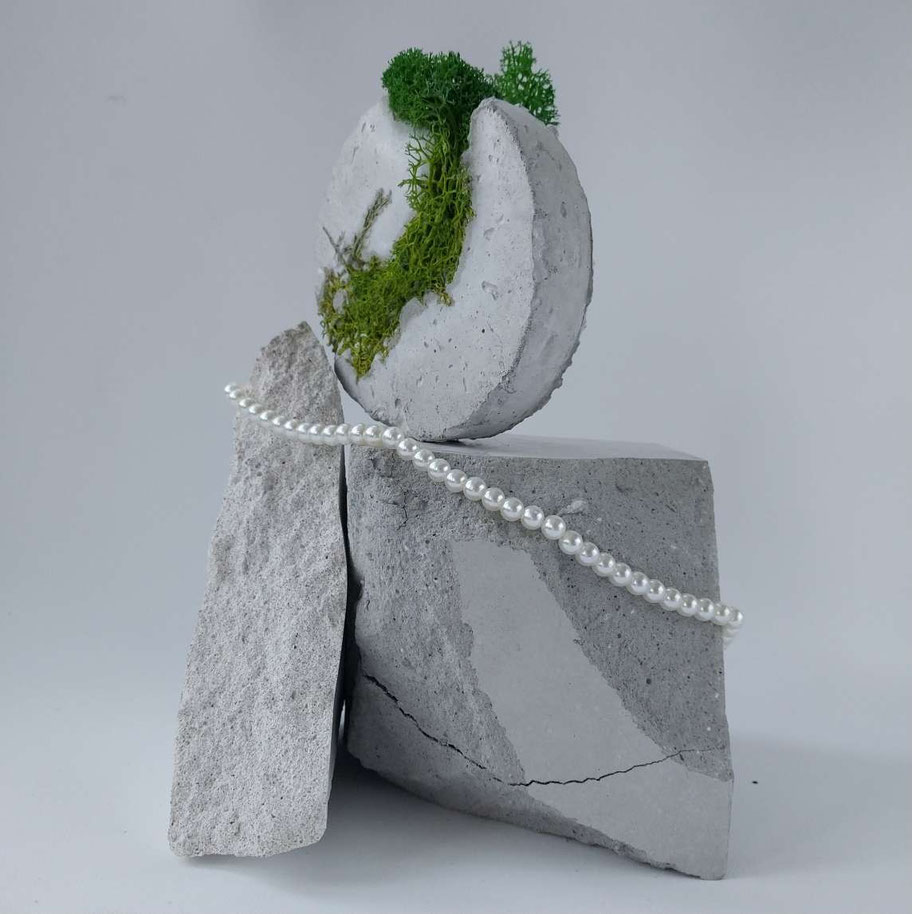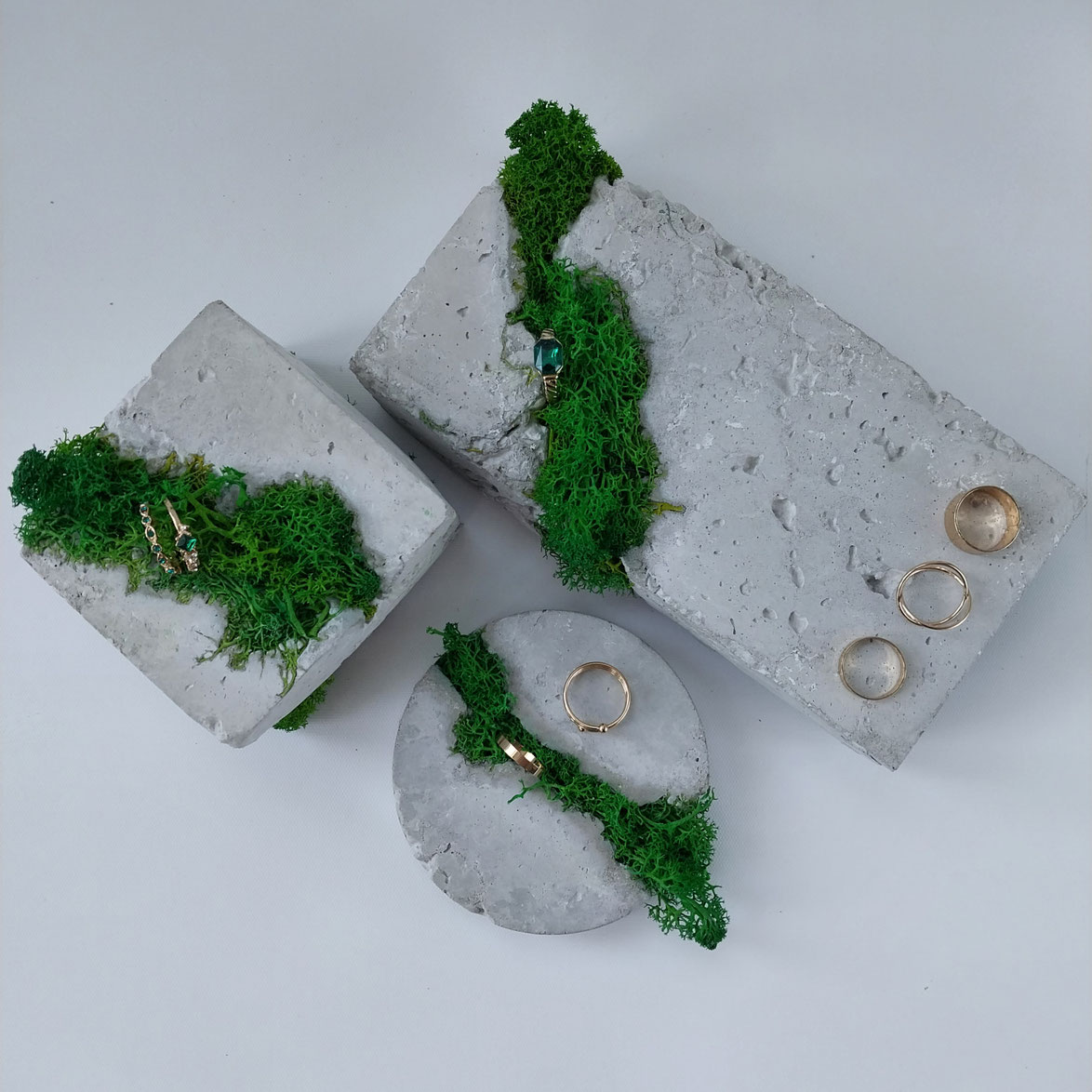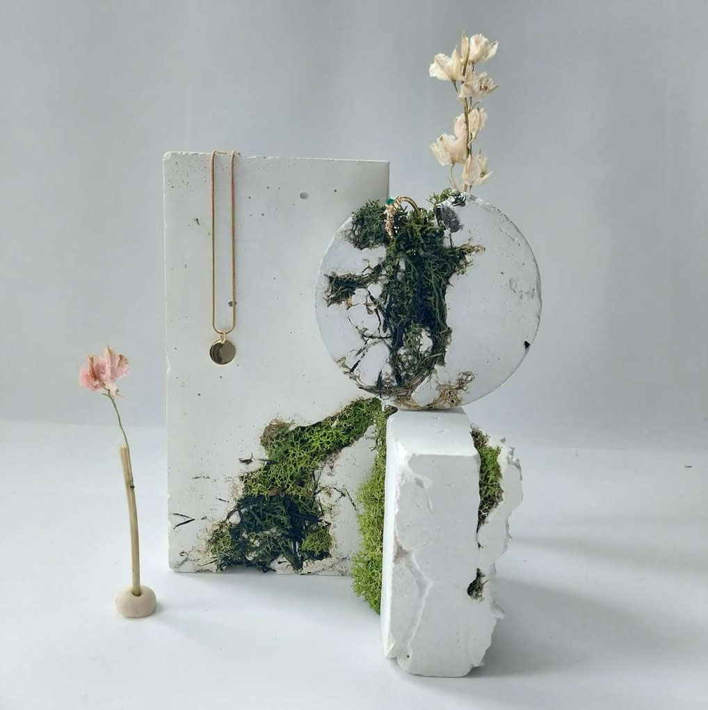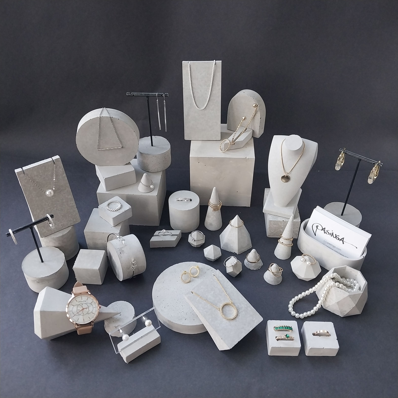 Eine Auswahl handgefertigter Schmuckständer und skulpturaler Schmuckhalter. Durch ihre unterschiedlichen Set-Kombinationen, Texturen, Schattierungen und natürlichen Betonfarbtöne – sowie durch ihre besonderen Formen – entstehen einzigartige Schmuckdisplays.